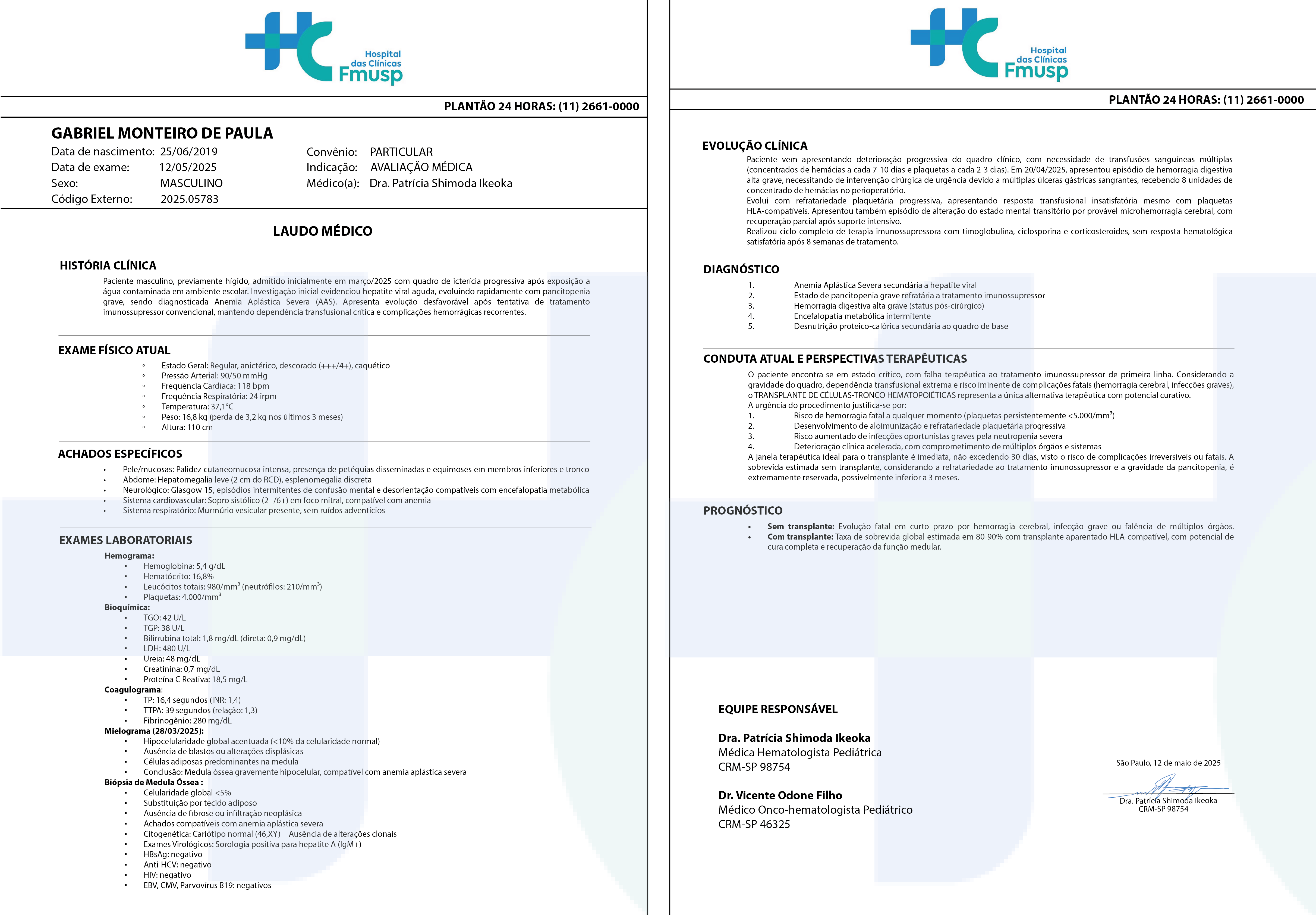 "O quadro do Gabriel é gravíssimo. A medula não respondeu a nenhum tratamento. O transplante de células-tronco é a única opção."